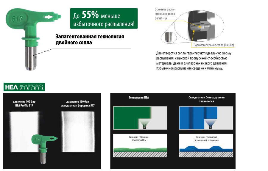 HEA (High Efficiency Airless) – эффективная безвоздушная технология. Инновационная технология форсунок HEA позволяет работать в диапазоне низкого давления распыления: 80 – 140 бар. Преимущества: