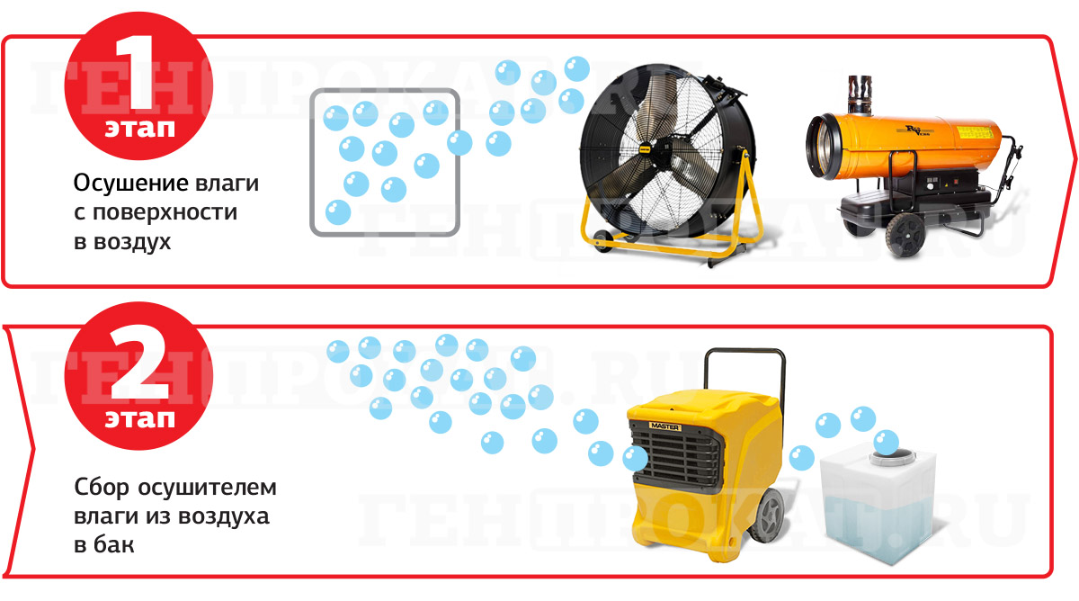 Принцип осушения помещений в 2 этапа